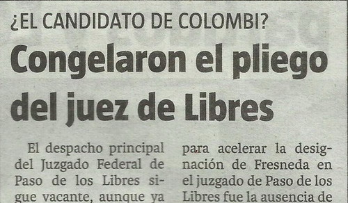 “El despacho principal del juzgado de Paso de los Libres sigue vacante, aunque ya hay un candidato para el cargo: Gustavo del Corazón de Jesús Fresneda”. Así comienza un breve artículo publicado en el diario Norte de Corrientes (en su versión impresa), y lo reproducimos de manera textual en nuestro sitio web, con los créditos que corresponden.