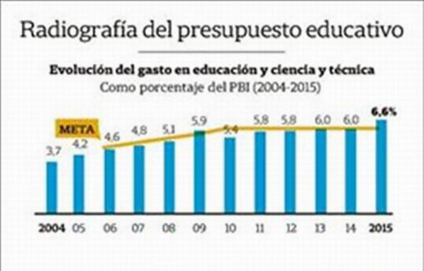 La aprobación de la LFE estableció nuevos pisos para el gasto público en Educación y Ciencia y Técnica, y específicamente, estipuló que el gasto en Educación debería alcanzar el 6 por ciento del PIB en un plazo de 10 años. El Gasto Público Consolidado (GPC) (el gasto agregado de Nación, Provincias y Municipios) en Educación, Ciencia y Técnica incrementó en más de 50 por ciento su participación en el Producto Interno Bruto (PIB), al pasar de 4,2 por ciento del PIB en 2005 a 6,6 por ciento del PIB en 2015. No obstante, este aumento no fue un hecho aislado, sino que sucedió en un contexto de crecimiento de la economía y de una suba notoria en la presión tributaria y del gasto público. Es decir, se pudieron destinar mayores recursos al sector educativo, sin necesidad de priorizar en el agregado este rubro por sobre otros, por lo que su participación en el total se mantuvo constante en aproximadamente 15,5 por ciento del GPC.