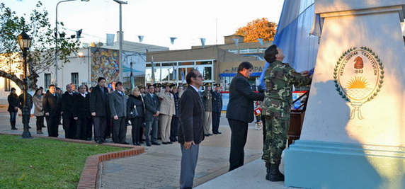 A continuación se entonaron las estrofas del Himno Nacional Argentino, ejecutado por la banda militar “Vuelta de Obligado”; seguido de las invocación religiosa del padre Javier Romero, cura párroco de la iglesia “San José” y de palabras alusivas a cargo de Margarita Torres, directora de la Escuela Primaria N° 477 “Mercedes Franco”, refiriéndose a la creación del Pabellón Nacional por parte del general Manuel Belgrano.