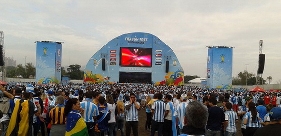 LA CAPITAL "GAÚCHA" VESTIDA CELESTE Y BLANCO La invasión argentina en Porto Alegre fue realmente impresionante.  La caminata desde la terminal de Ómnibus hasta el Beira Río la separan 5 km, en ella sólo se veían Argentinos gritando, cantando con sus banderas y remeras, las amarrillas invisibles. En la Avenida Costanera, “Borges de Medeiros” aclaraba la jornada nublada y se podía divisar los campamentos Argentinos, entre ellas cientos de Combis y casas rodantes de distintos lugares, desde Neuquén hasta Salta, así podía percibirse en los carteles que dejaban verse, una verdadera marea Argentina.