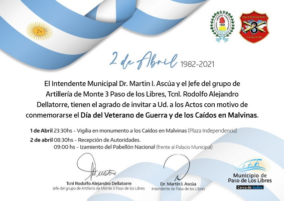Locales | El Intendente de Paso de los Libres, Martín “Tincho” Ascúa, acompañó a Excombatientes y familiares de Héroes de Malvinas en dos actos conmemorativos que se realizaron en la ciudad por el Día del Veterano y de los Caídos en la Guerra de Malvinas....
